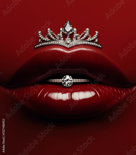 © sunaiart, Naklejka premium Regal Red Lips with Silver Crown & Diamond Ring - Luxury Lip Art for Cosmetic Branding & High-End Beauty Campaigns