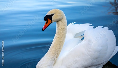 © Nisa, Obraz premium Regal swan with distinctive black beak gliding across serene blue water
