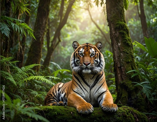 Obraz premium Regal tiger resting amidst lush, green foliage, sunlit forest