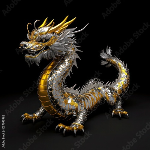 © Tuong, Fototapeta premium Regal Twin Dragons in Gold and Silver Pose with Alpha Path - 3D Rendering