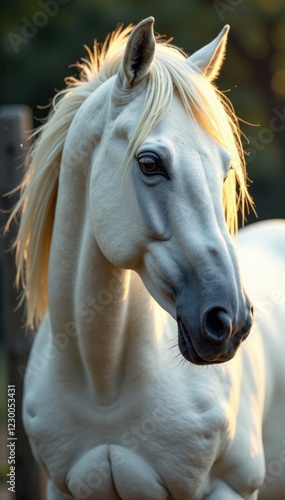 © Phennapha, Obraz premium Regal White Stallion with Shimmering Coat, shimmer, horse, light