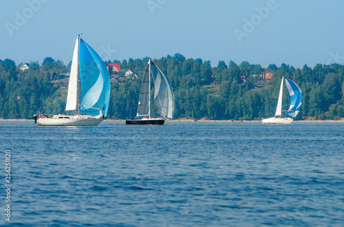 Fototapeta premium Regatta sailing boats on the river, reflection on the water in the distance...