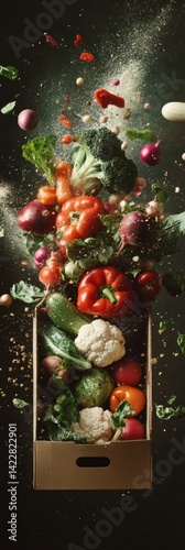 Fototapeta premium Regenerative Harvest Explosion Artisan CSA Farm Box Unveiling Vibrant Organic Produce with Dynamic Culinary Storytelling in Sustainable Agriculture