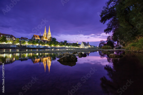 © Thomas, Naklejka premium Regensburg mit spiegelung bei Niedrigwasser zur blauen Stunde