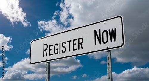 © Erlinda, Fototapeta premium register now text on road sign with clouds and sky background