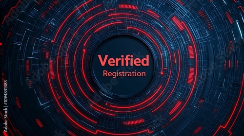 © PixelPlace, Obraz premium Register verification. A circular digital design featuring the words "Verified Registration" in bold red, set against a dark, high-tech background with intricate patterns.