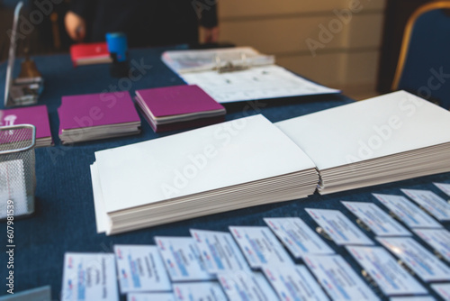 Fototapeta premium Registration desk table, process of checking in on a conference congress...