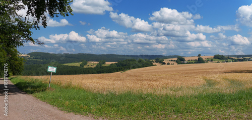 © michoff, Obraz premium Reifes goldgelbes Getreide auf einem Feld in der Nähe von Frauenstein (Erzgebirge); der Himmel voller Schönwetterwolken, die Landschaft lädt zum Wandern ein
