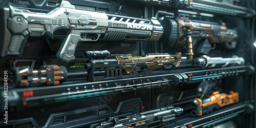 Fototapeta premium Reimagined Cyberpunk Armory: A vibrant array of futuristic gadgets and...