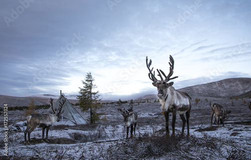 Obraz premium rein deer in a snow in northern Mongolia