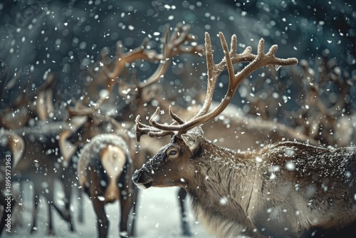 Naklejka premium Reindeer are walking in the snowy forest during winter