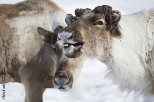 © olenyok, Fototapeta premium Reindeer at the spring snow. Moma Mountains. Yakutia. Russia.