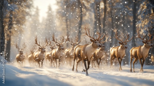 Fototapeta premium Reindeer herd running through snowy forest. (1)