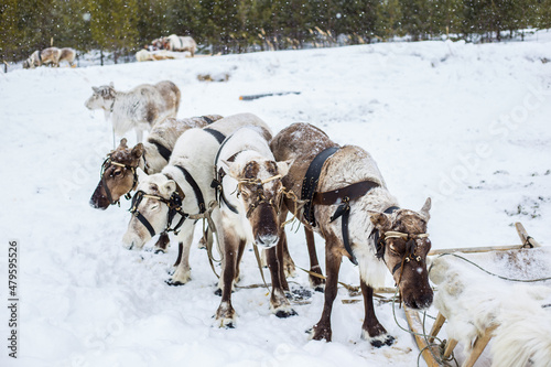 © Natalia, Naklejka premium Reindeer in a team in winter in northern Russia, Khanty-Mansiysk District, at the celebration of the Day of the Reindeer Herder