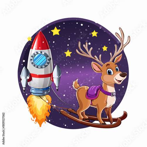 Naklejka premium Reindeer pulls rocket through starry night sky