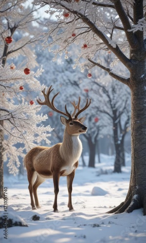 © Katherina, Fototapeta premium reindeer standing near a snowy tree with ornaments, winter, animal