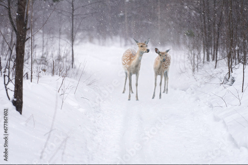 Fototapeta premium Reindeer with calf on the trail in the winter snow-covered forest. Blizzard.