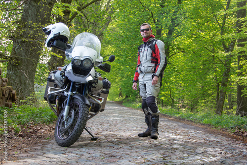 © Torsten Rauhut, Fototapeta premium Reiseenduro Motorrad im Wald mit Fahrer - Blick in die Ferne