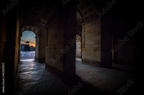 © parallel_dream, Fototapeta premium Reiterstatue im Sonnenaufgnag