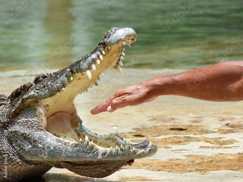 Obraz premium ręka w paszczy krokodyla, świat krokodyli, Tajlandia