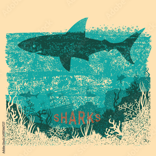 © GeraKTV, Obraz premium Rekin pływanie w morzu na stary tło plakatu papieru z tekstem