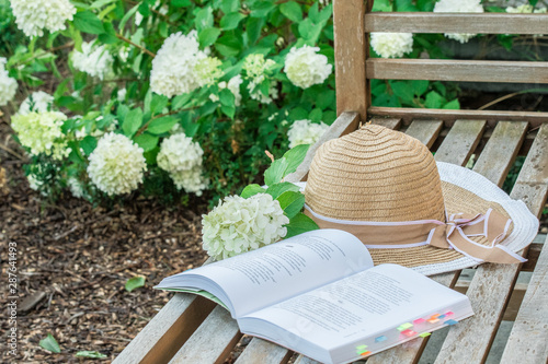 © Beenis, Fototapeta premium Relaks z książką w ogrodzie
