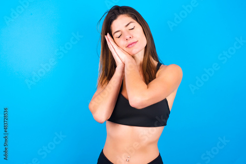 © Jihan, Fototapeta premium Relax and sleep time. Tired Young beautiful sportswoman doing sport wearing sportswear over blue background with closed eyes leaning on palms making sleeping gesture.