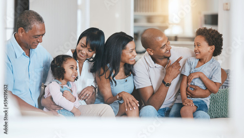Fototapeta premium Relax, big family and smile in home on sofa in living room, bonding or having fun. Grandparents, parents and happiness of children on couch, care or enjoying quality time together in lounge in house.