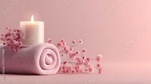 Naklejka premium Relaxation essentials candle and towel arrangement in soft pink spa setting minimalist view
