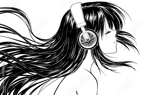 Fototapeta premium Relaxed anime girl in headphones listening to music