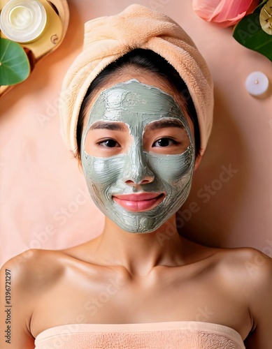 © ketkata, Fototapeta premium Relaxed Asian Woman with Facial Mask Enjoying Spa Treatment