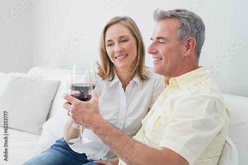 Fototapeta premium Relaxed couple with wine glasses sitting on sofa