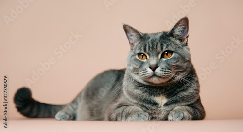 © gn8, Obraz premium Relaxed gray tabby cat on soft pink background for pet lovers and home decor