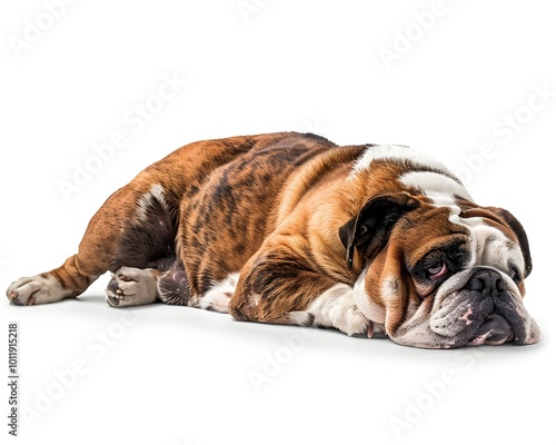 Obraz premium Relaxed Overweight Bulldog Lying Comfortably on White Background with Copy Space