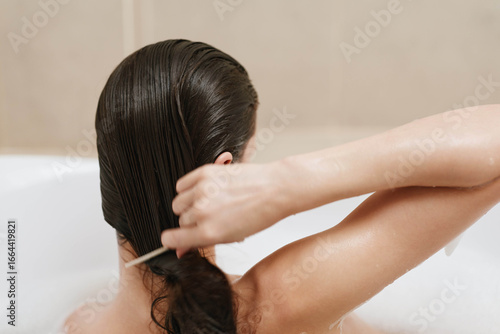 Naklejka premium Relaxed woman with long, wet hair combing her hair while taking a bath,...