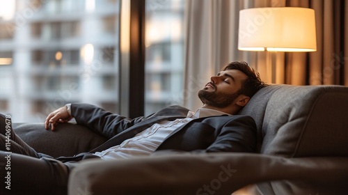 Fototapeta premium Relaxed young Caucasian man in a suit unwinds on a modern sofa, basking in...