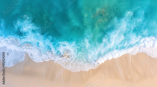 © Generative AI, Fototapeta premium Relaxing aerial beach scene summer vacation holiday template banner Waves surf with amazing blue ocean lagoon sea shore coastline Perfect aerial drone top view Peaceful bright beach se : Generative AI
