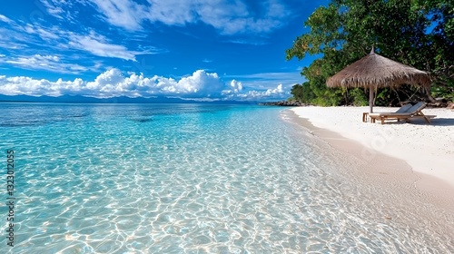 © Argan, Fototapeta premium Relaxing Beach Scene with Clear Water and Thatched Umbrella