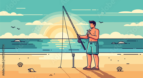 Fototapeta premium Relaxing Coastal Fishing With a Drink on a Bright Sunny Day Vector