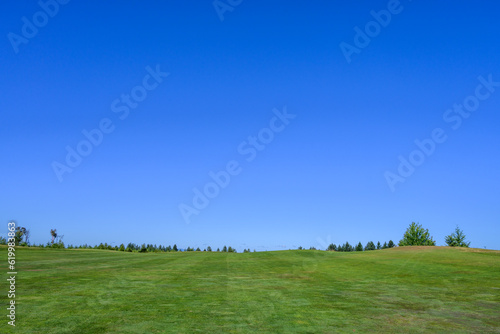Fototapeta premium Relaxing day on the golf course, fairway grass running up to clear blue sky,...