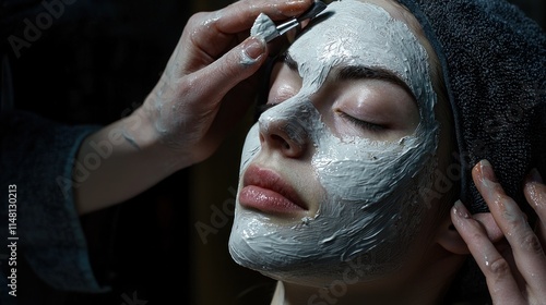Fototapeta premium Relaxing Facial Mask Application: A Close-Up Shot of a Woman Receiving a Clay Mask Treatment