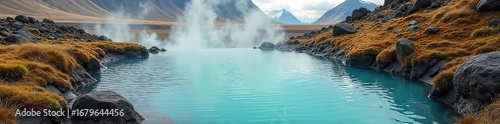Naklejka premium Relaxing in a geothermal pool surrounded by stunning Icelandic landscape Steaming water, rugged mountains, vibrant moss Perfect for travel, spa, nature imagery , tranquility, mineral