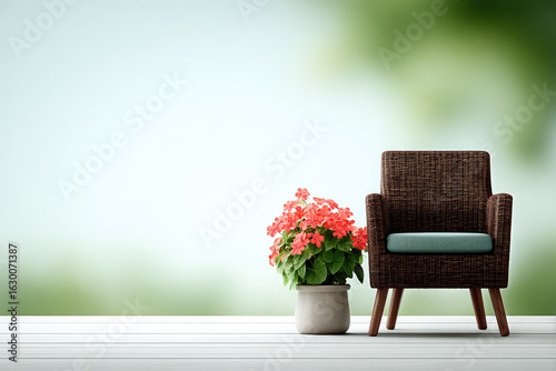 © Mongkol, Fototapeta premium Relaxing outdoor scene with woven chair and potted flowers serene garden setting still life photography soft focus background tranquility concept