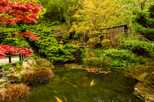 Obraz premium Relaxing scene from a koi fish pond inside a decorative Japanese Garden with...