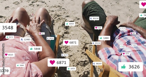 Fototapeta premium Relaxing senior couple reclining on beach chairs on sand, with floating heart and thumbs-up icons