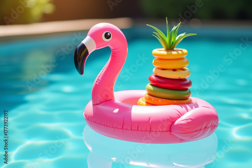 Fototapeta premium Relaxing Summer Vibes: Tropical Fruit Stack on Pink Flamingo Floatie in Pool