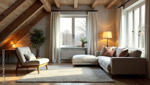 © MonikaPixArt 19, Naklejka premium Relaxing Sunlight Illuminates a Cozy Living Room with a Sectional Sofa and a Comfortable Accent Chair in a Home with Wooden Beams