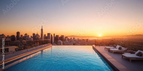 Fototapeta premium Relaxing sunset view from rooftop pool in city skyline