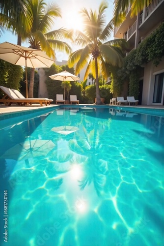 Obraz premium Relaxing turquoise swimming pool water with sun reflections, ideal for summer vacation brochures or website backgrounds Perfect for travel, holiday, and resort themes , summer, depth