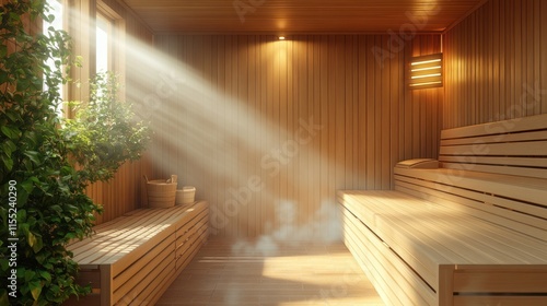 © AFFANYUDA, Obraz premium Relaxing wooden sauna with steam and sunlight.